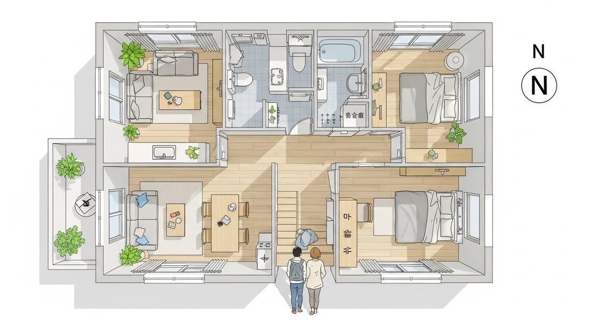 北玄関はプライバシーを保ちやすく、南側にまとまった採光を取りやすいという利点があります。一方で玄関付近が暗くなりがちなので、光と断熱の工夫が必要です。ここからは利点と対策を見ていきます。