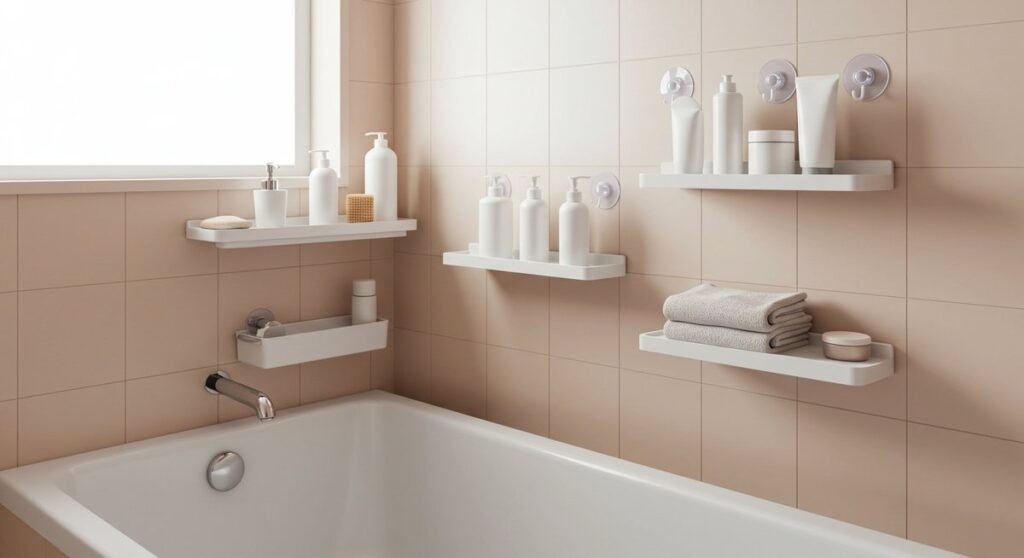 マグネットがつかないお風呂でもできる浮かせる収納テク!吸盤・粘着・突っ張りで床をスッキリ