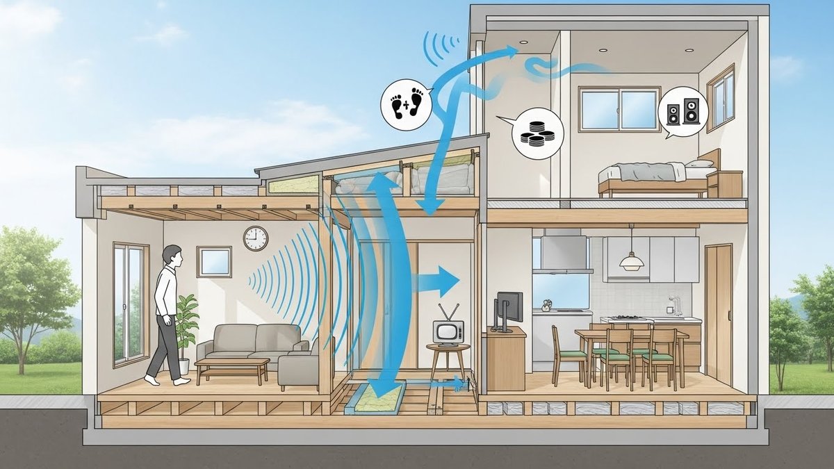 建物の構造によって音の伝わり方は変わります。木造は床や梁がつながっているため、点の衝撃が線として伝わりやすく、足音が響きやすい特徴があります。一方で鉄筋コンクリート造は床が比較的重く音の伝播が抑えられることが多いです。