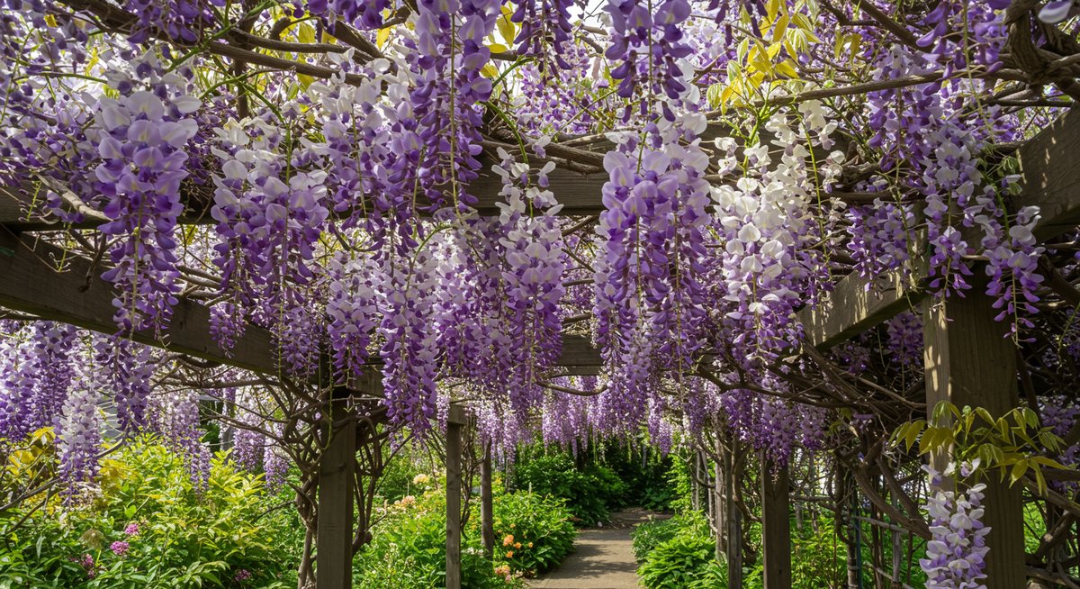定期的に古いツルを取り除き、新しい枝を棚に沿わせることで花付きが良くなります。構造物は丈夫で耐荷重の高いものを選び、ツルの重さに耐えうる設計にしておくことが重要です。