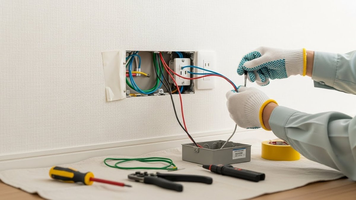 主な工具は下地探知機、ドリル、ノコギリ、ケーブル引き工具、電工ドライバー、絶縁測定器、配線モールやジョイントボックスです。個人で行う場合は適切な工具と安全装備を揃え、危険箇所には手を出さないことが重要です。