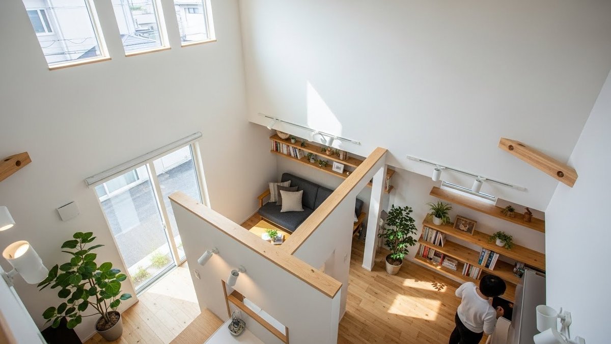 吹き抜けと階段やロフトを組み合わせると、立体的な動線と視線のつながりが生まれます。階段横に小さな吹き抜けを作ると圧迫感なく空間が伸び、光と風を取り込みやすくなります。