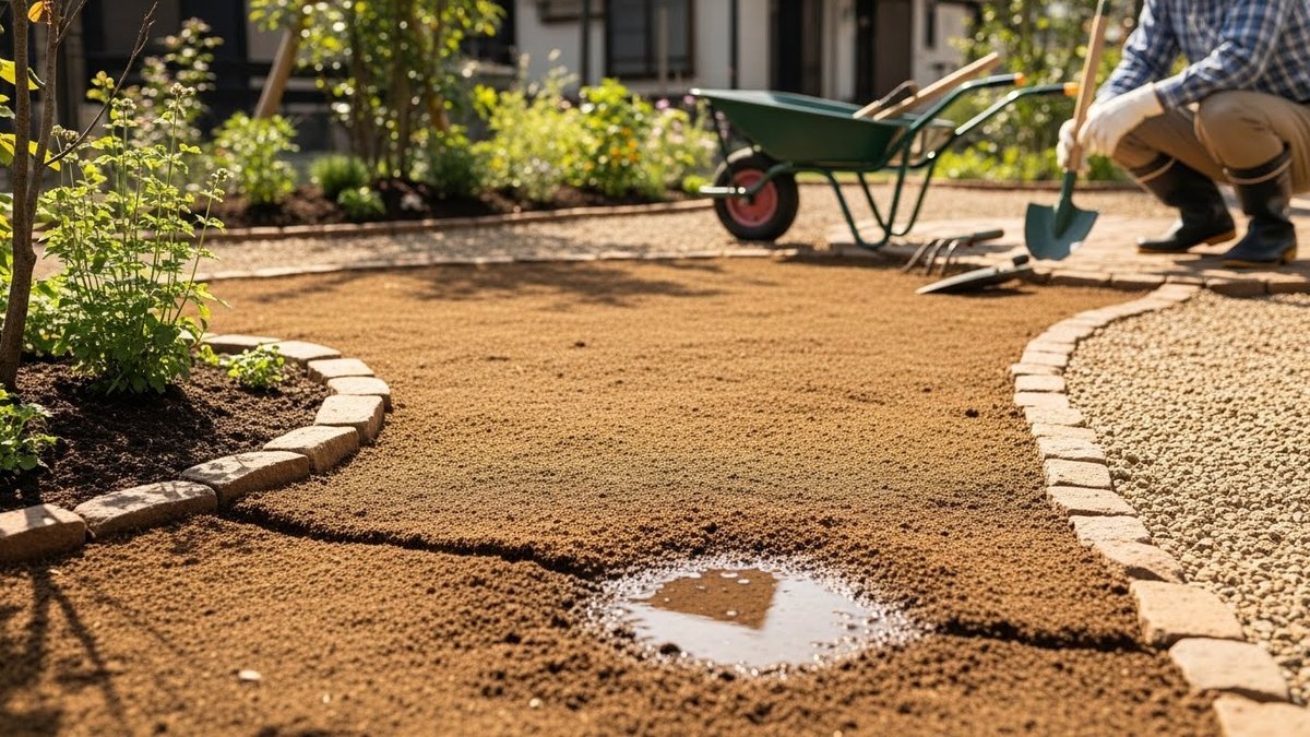 水はけ改善には砂や腐葉土を混ぜる作業が有効です。表土を掘り起こして通気性を上げ、改良材を混ぜ込むだけで長期的に効果があります。小規模ならスコップとレーキで自分でも作業できます。